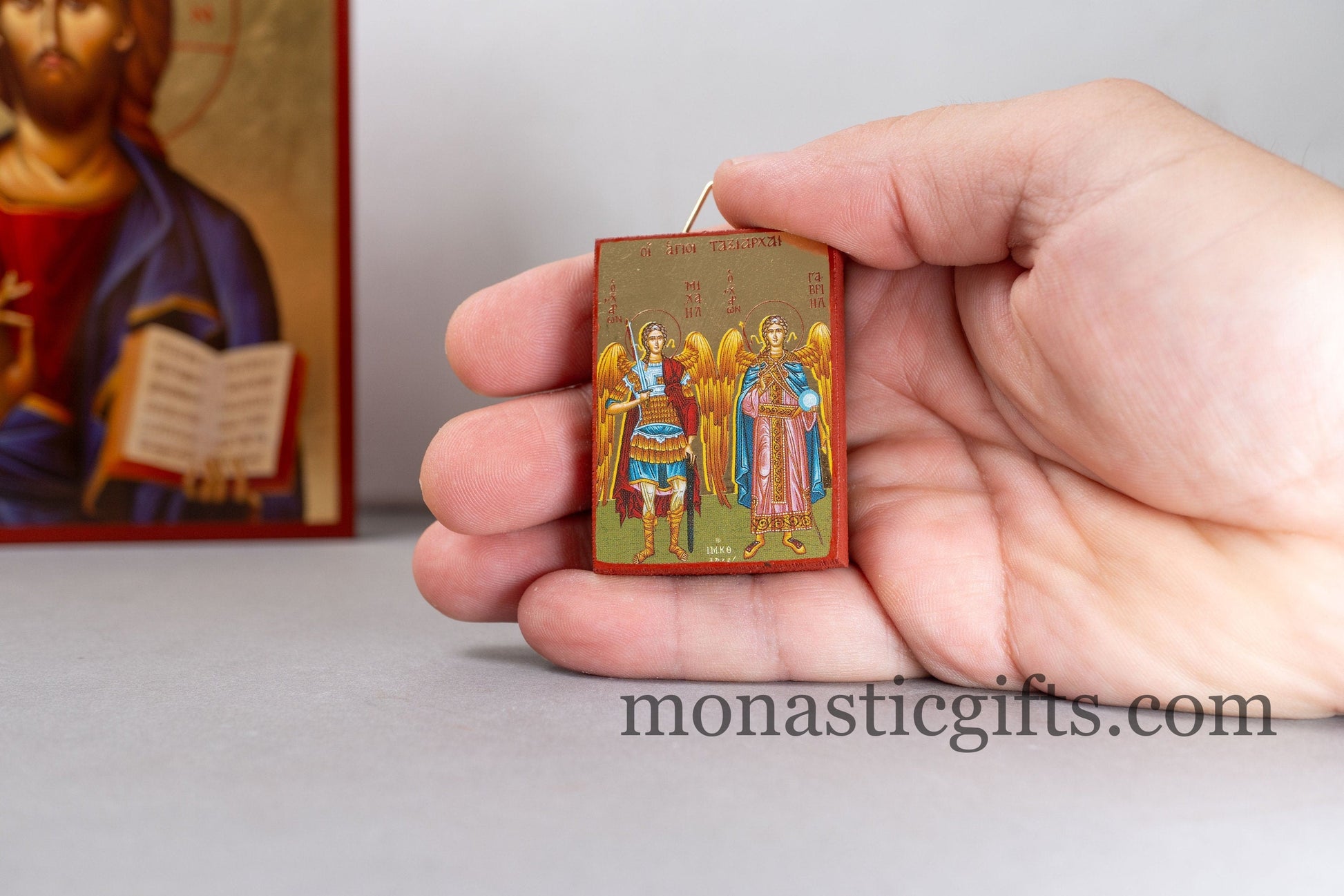 Small Wooden Orthodox icon with amazing details Archangels Michael and Gabriel (The Protectors) In Golden leaf, wall hanging amazing idea for orthodox gift.